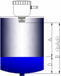 安裝位置(B)為罐底至物位儀探頭端面的總高度,A為探頭端面到液面的距離,D為液面的高度,即D=B(安裝位置)-A,使用此功能時物位儀顯示值為液面的高度(D)。
