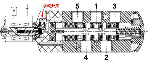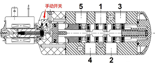 當(dāng)ASCO 531電磁閥電源故障沒(méi)電時(shí),可以通過(guò)手動(dòng)開(kāi)關(guān)控制閥位切換,逆時(shí)針旋轉(zhuǎn)手動(dòng)開(kāi)關(guān),鐵芯向左運(yùn)動(dòng),閥芯向右運(yùn)動(dòng),進(jìn)氣口1與出氣口4相通;