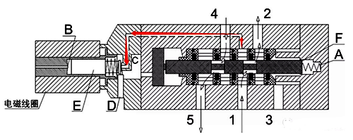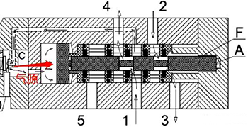 在電磁閥失電狀況下,進(jìn)氣口1與出氣口2相通,出氣口4與排氣孔5相通,活塞F在閥內(nèi)彈簧A的彈力下保持在左邊的位置,進(jìn)氣口1處的氣源通過(guò)下圖紅色箭頭孔(該進(jìn)氣孔為獨(dú)立孔,只與進(jìn)氣口1連接,不與出氣口4連接)連接腔室內(nèi)的C進(jìn)氣口;