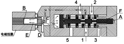 當(dāng)電磁閥得電,鐵芯E克服彈簧的彈力向左運(yùn)動(dòng),進(jìn)氣口C開(kāi)始進(jìn)氣,在氣源壓力下推動(dòng)活塞F克服彈簧A的彈力向右運(yùn)動(dòng),進(jìn)氣口1與出氣口4相通,出氣口2與排氣孔3相通,4接閥門(mén)氣缸上室,閥門(mén)將關(guān)閉;