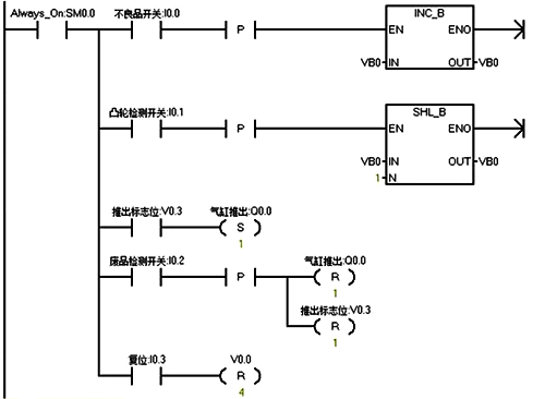 2、當第N個產品移動了4次后,VB0中的V0.3位為1,而產品剛好到達第“4”號工位,Q0.0為1,氣缸推出。當第N+1個產品移動了4次后,VB0中的V0.3位為1,而產品剛好到達第“4”號工位,Q0.0為1,氣缸推出。