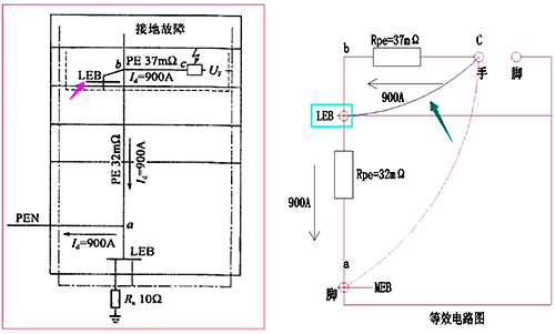 如上圖設置的LEB通過扁鋼與MEB連接,等效電路圖如右所示,僅僅是在干線PE基礎上增加一個并聯旁路,人和手之間電位差為900×(支線PE電阻+干線PE并聯扁鋼電阻),其值很可能還是大于安全電壓50V。