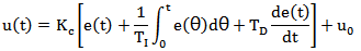 u(t)為PID控制器輸出;u0為初始PID控制器輸出;Kc為總增益;TI為積分時間或重置時間;TD為微分時間;e(t)為設定值和過程值得偏差