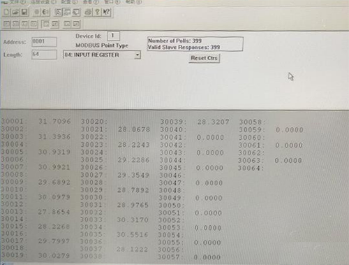 3、參考無(wú)紙記錄儀說(shuō)明書(shū)及通信協(xié)議,使用Modscan32軟件測(cè)試網(wǎng)絡(luò)通信,確保Modscan32軟件能準(zhǔn)確讀到無(wú)紙記錄儀的溫度。