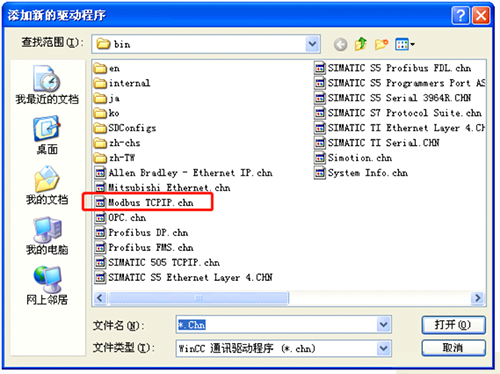 3、在彈出的對(duì)話框中選擇“Modbus TCPIP.chn”,如下圖所示: