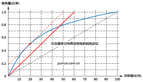 例如,像上圖所示冷卻特性的控制對象,在穩定運行期間負載率在20%的場合,將冷卻側20%附近的冷卻特性近似看作直線決定PID參數,在這個負載率附近控制的話,可以得到良好的控制效果。