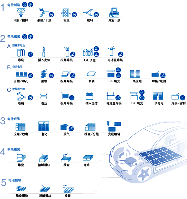 電池生產(chǎn)產(chǎn)細(xì)分為電極制造、電池組裝、電池成型、電池組裝和電池模塊五個(gè)大的生產(chǎn)環(huán)節(jié),如下圖所示:
