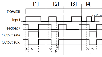 該工作模式下:如果不考慮反饋信號,則當S32輸入端從0變為1時,安全常開觸點閉合,輔助常閉觸點斷開;如果考慮反饋信號,則當S32輸入端從0變為1,并且反饋信號從1變為0時,安全常開觸點閉合,輔助常閉觸點斷開;當S32從1變為0時,開始計時。當設置的時間到了之后,安全常開觸點斷開,輔助常閉觸點閉合,恢復成初始狀態。在計時的過程中,無論S32的信號是否變化,定時器不會被重復觸發,直到之前設置的時間走完,這種稱為“不可重復觸發”;該工作模式的時序圖如圖3所示: