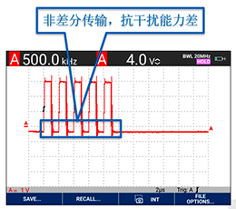 通過查看并分析RS485通訊過程中傳送波形的頻率、幅值及形狀,即可直觀地判定出通訊是否正常以及通訊線路自身的的抗干擾情況。