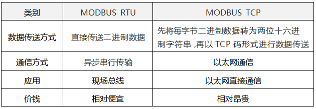 表1 MODBUS TCP和MODBUS RTU的比較