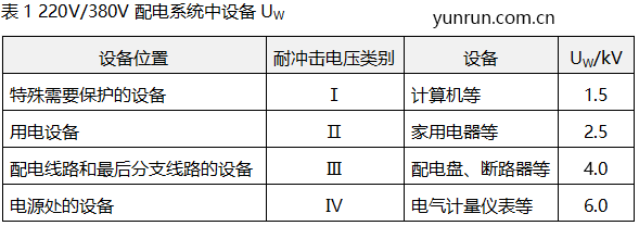 由總配電箱引入后級(jí)的線路,由于空間屏蔽等作用,可能遭受的過(guò)電壓將逐漸減小,需要安裝的SPD規(guī)格也可逐級(jí)降低,直到將過(guò)電壓限制在被保護(hù)設(shè)備能承受的電壓能力內(nèi)。建筑物內(nèi)部的線路上不同位置的設(shè)備可根據(jù)被保護(hù)設(shè)備的UW選擇合適Up值的SPD,見(jiàn)表2。