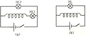 圖十二為兩個實驗電路,在圖(a)電路中,當開關閉合時,燈泡HL2馬上變亮,而燈泡H1慢慢變亮,然后亮度不變;在圖(b)電路中,當開關閉合時,燈泡HL馬上變亮,開關斷開時,HL不會馬上熄滅,而是慢慢熄滅。