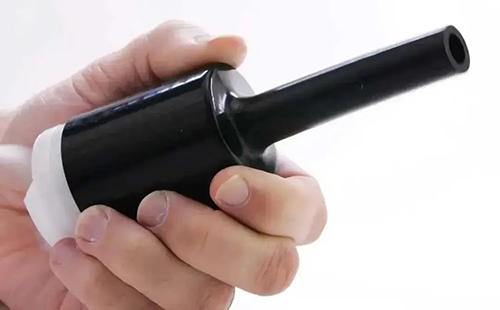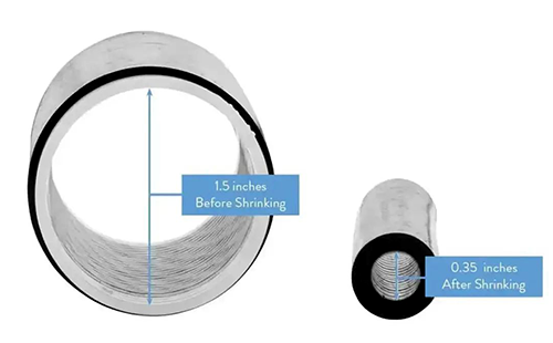 下圖是一種冷縮管模型在施膠前后的示例。圖像左側是“之前”,或冷縮預縮版本,塑料芯就位。該核心在照片的“后”部分被移除,可以看到管子縮小到的尺寸,如右圖所示。