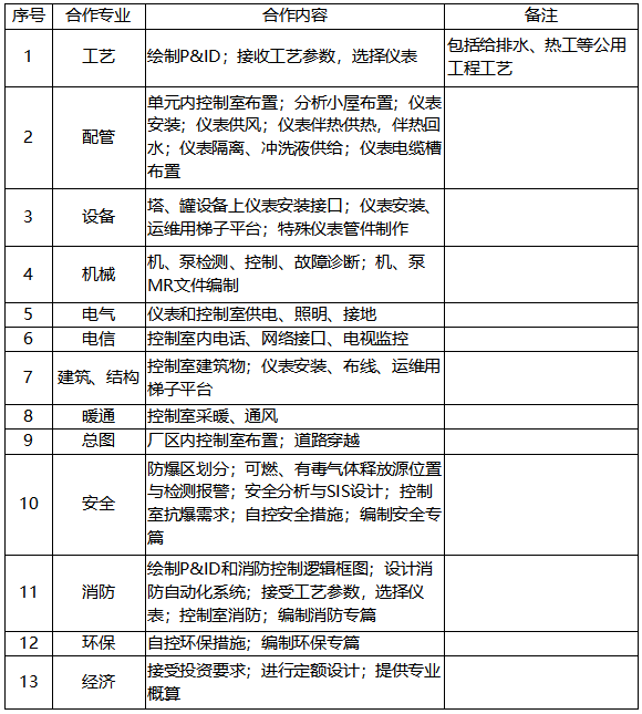 自控設(shè)計合作貫穿于自控專業(yè)與工藝專業(yè)、配管專業(yè)、設(shè)備專業(yè)、機械專業(yè)、電氣專業(yè)、電信專業(yè)、建筑/結(jié)構(gòu)專業(yè)、暖通專業(yè)、總圖專業(yè)、安全專業(yè)、消防專業(yè)、環(huán)保專業(yè)、經(jīng)濟專業(yè)等之間,彼此牽制彼此配合。本文詳細介紹自控工程設(shè)計之自控專業(yè)與電信、建筑/結(jié)構(gòu)、暖通、總圖、安全、消防、環(huán)保、經(jīng)濟專業(yè)的設(shè)計合作。