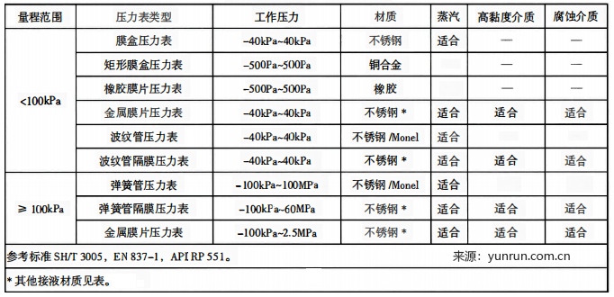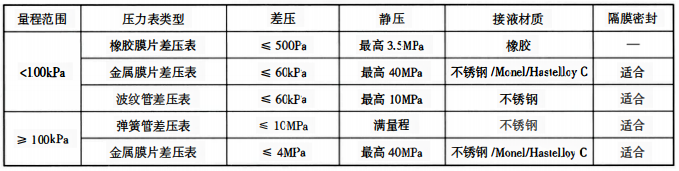 1、壓力表類型的選擇見表1,差壓表類型的選擇見表2。