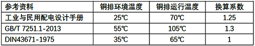 將DIN43671-1975的銅排載流量作為參考,工業與民用配電設計手冊、GB/T7251.1標準中銅排載流量理論計算的系數如下表。