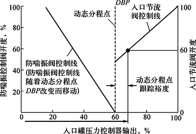 將動態分程調節系統的分程點限定在壓力控制器輸出的50%-100%,當解耦控制系統壓力控制器的輸出在動態分程點時,解耦控制系統使防喘振閥全關(0);當壓力控制器的輸出在動態分程點減去50%時,解耦控制系統使防喘振閥全開(100%)。