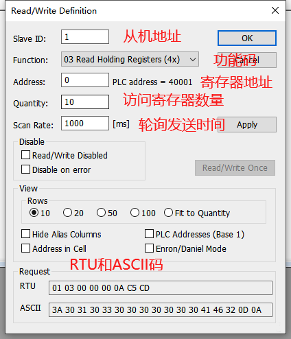 Scan Rate為讀取數據周期,輪詢發送,單位毫秒。