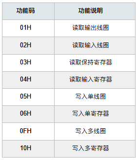 MODBUS協議同時規定了二十幾種功能碼,但是常用的只有8種,用于對存儲區的讀寫,如下表所示: