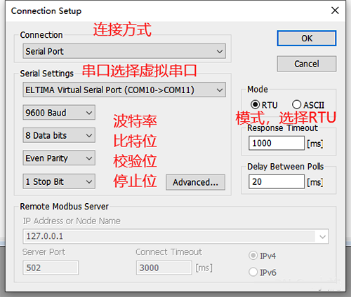 端口主從機分別選擇我們虛擬出來的com10和com11端口,其他選項如波特率9600,比特位8,校驗位1,無等價位等可以保持不變,然后點擊確定進行連接,未連接成功窗口第二行會給出提示信息。