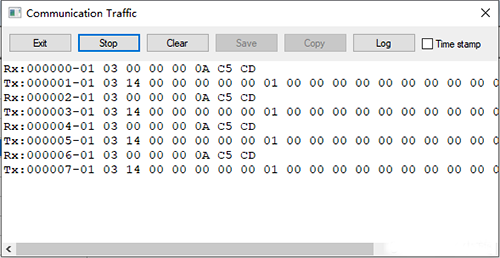 點擊“Display”----“Communicatio”,可以調出串口收發數據幀監視信息對話框,用來查看分析收發的數據幀。如下圖所示: