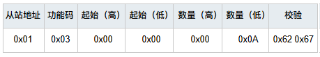0x00 0x0A:查詢的寄存器數量為0x000A(10)個 Modbus把數據存放在寄存器中,通過查詢寄存器來得到不同變量的值,一個寄存器地址對應2字節數據; 寄存器地址對應著從機實際的存儲地址