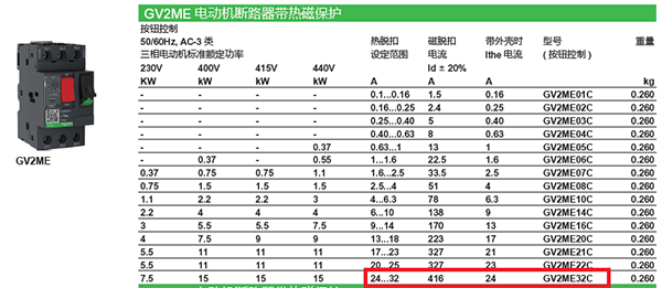 回到文章前面,空壓機額定功率11.2kW±7%,工作電流為23.5A+20%/-10%,即21A~28A。我們選擇過載保護整定電流范圍為24~32A的GV2ME32C電動機保護斷路器,保證電動機的額定電流落在斷路器整定電流范圍之內(nèi)。