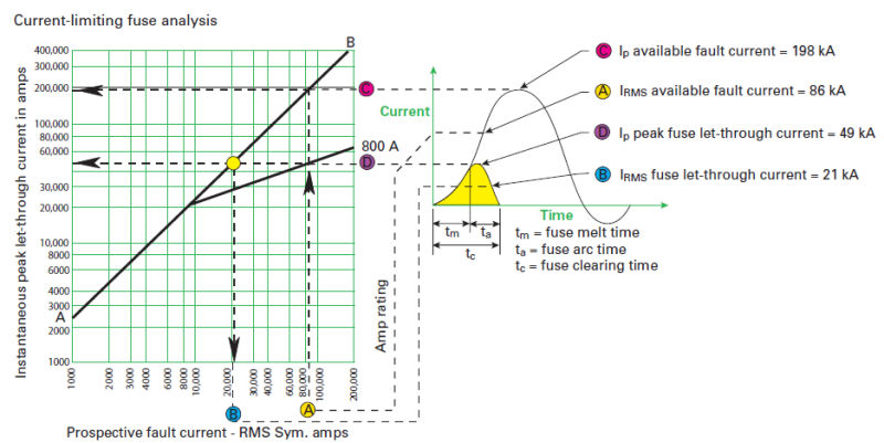 例如,某電氣系統(tǒng)的預(yù)期短路電流為86kA(A點(diǎn)),預(yù)期短路電流峰值為198kA(C點(diǎn))。斷路器或熔斷器的額定電流為800A,其短路分?jǐn)嗄芰χ辽贋?6kA,只有這樣才具備分?jǐn)囝A(yù)期短路電流的能力。