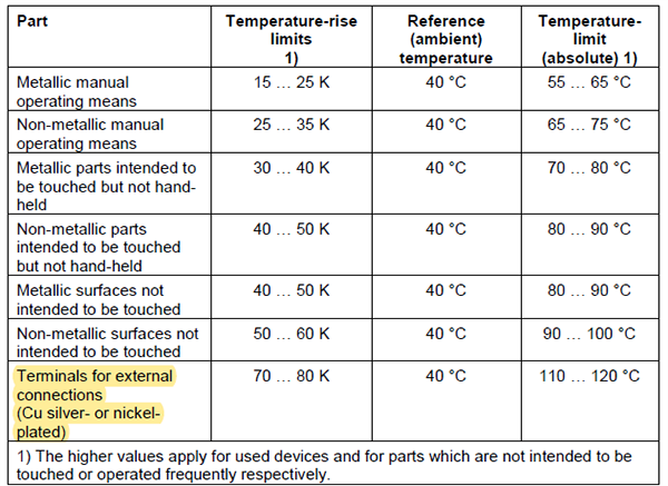 首先,從產品國家標準層面,GB/T14048.1以及IEC60947-1已經很明確的告訴我們,低壓電器的端子溫升,裸銅端子允許的溫升極限是60K,鍍錫端子允許的溫升極限是65K,鍍銀端子允許的溫升極限是70K。