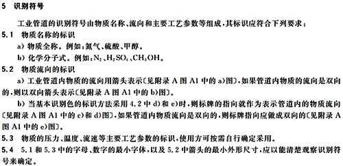 當采用②③④⑤方法時,二個標識之間的最小距離應為10m,③④⑤的標牌最小尺寸應以能清楚觀察識別色來確定。當管道采用②③④③基本識別色標識方法時,其標識的場所應該包括所有管道的起點、終點、交叉點、轉彎處、閥門和穿墻孔兩側等的管道上和其他需要標識的部位。