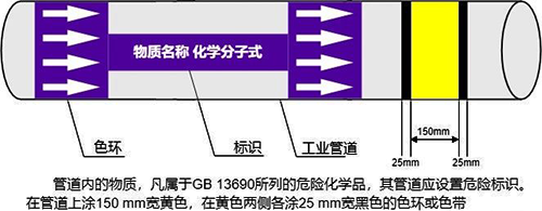 適用范圍:管道內的物質,凡屬于GB13690所列的危險化學品,其管道應設置危險標識。