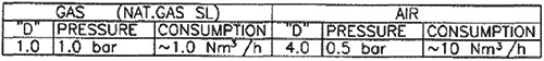 點火槍廠家推薦的點火瓦斯和配風壓力見表1。