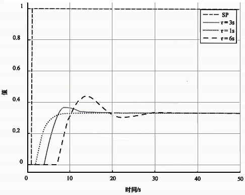 圖2是不同時間常數基準自衡對象Kc=0.25時設定值階躍響應。可以發現:隨著被控對象時間常數的增加,設定值階躍響應越來越緩慢。所以最優比例增益應該和被控對象的時間常數成正比。被控對象時間常數越大最優比例增益應該越大,反過來被控對象時間常數越小最優比例增益應該越小。