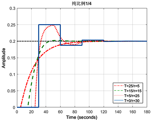 如果希望所有的一階純滯后自衡對象都1/4衰減振蕩,則工程上的比例邊界就可以利用ZN法砍一半設置為1/2K。在現代整定方法中都追求有超調無振蕩,則工程上的比例增益邊界可以繼續砍一半為1/4K。這個比例增益既是所有一階純滯后自衡對象的比例邊界,也是一個適用于所有一階純滯后自衡對象的通解。通解對不同T/τ的響應如下圖。