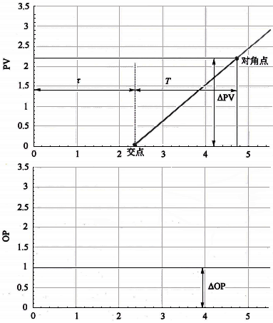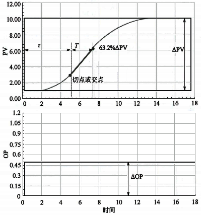 在初始穩(wěn)態(tài)條件下做開環(huán)階躍測試。將PID控制器的輸出(OP)進行幅度為△OP的階躍改變并保持,過程變量(PV)將會發(fā)生改變并最終穩(wěn)定變化。這種描述系統(tǒng)或過程中輸入與輸出關(guān)系的曲線稱為“過程響應曲線”。在許多領(lǐng)域,都使用響應曲線進行分析和優(yōu)化過程的性能。
