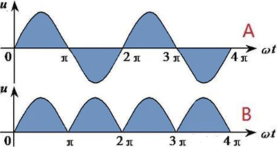 直流電又分恒定直流和脈動直流,恒定直流的大小和方向不隨時間改變,水平的一條直線,而脈動直流,大小隨時間改變,但方向不隨時間變化,也就是說,任何瞬間,它都跳不到負半軸。