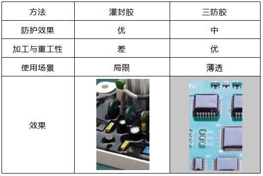 灌封膠與三防膠兩種方法的對(duì)比如下: