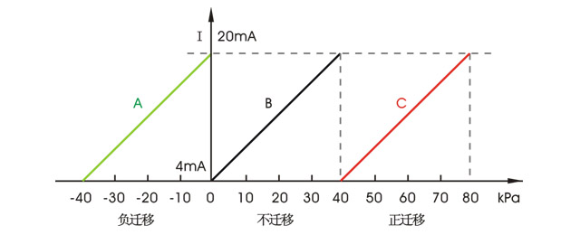 變送器的測(cè)量范圍等于量程和遷移量之和,即測(cè)量范圍=量程范圍+遷移量如圖所示,圖中A量程為40kPa,遷移量為-40kPa,測(cè)量范圍為-40~0kPa;B量程為40kPa,無遷移量,測(cè)量范圍為0-40kPa;C量程為40kPa,遷移量為40kPa,測(cè)量范圍為40-80kPa。