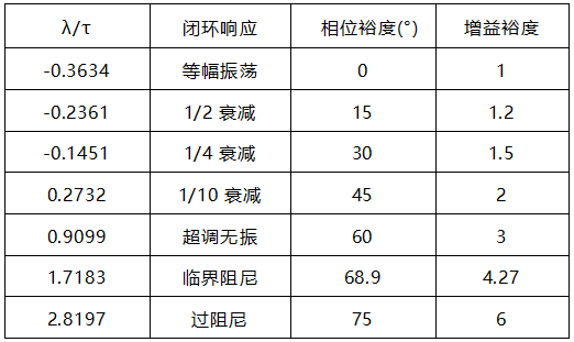 從更廣泛意義上看,選擇積分時間等于時間常數(shù)后,比例增益應該和時間常數(shù)成正比,和增益、純滯后成反比。想獲得不同的閉環(huán)性能可以選擇不同的系數(shù)。這樣可能的整定公式可以描述如下。其實a=2超調、a=3臨界阻尼,a=3無超調、a=4過阻尼這些都是理論值的近似。而且當a≥2時,(a-1)τ基本上是期望的閉環(huán)時間常數(shù)。如果a小于2則可以獲得有超調的過程。嚴格意義上的解析解和頻域的相位裕度相關,見下表。