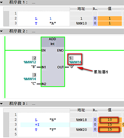 程序段2使用梯形圖編程,變量B加上變量C等于變量D,D當(dāng)前值為5并存儲(chǔ)在累加器1中,而程序段3則使用了語句表編程,裝載變量E到累加器1中,原累加器1中的值即5被壓入到累加器2中,該段程序相當(dāng)于變量D+E,然后將結(jié)果傳送到變量F中,從在線監(jiān)視中可以看到變量F等于15。