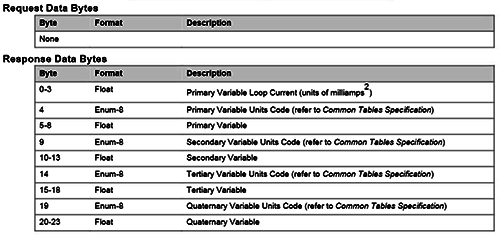 Read Dynamic Variable and Loop Current,讀動態變量和主變量電流,讀主變量電流和最多4個預先定義的動態變量(只讀PV時最少9字節,讀PV+SV+TV+QV時最多24字節,字節0-3:主變量電流,字節4:主變量單位代碼,字節5-8:主變量,字節9:第二變量單位代碼,字節10-13,第二變量,字節14:第三變量單位代碼,字節15-18:第三變量,字節19:第四變量代為代碼,字節20-23:第四變量)。