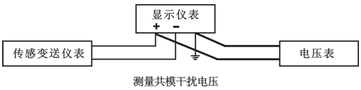 測量串模干擾電壓,以往推薦用電子管電壓表,在現(xiàn)場可使用有交流毫伏擋的數(shù)字萬用表進行測量。如上圖所示,把電壓表跨接在儀表輸入的正、負端之間測量,通常串模干擾電壓大多在幾毫伏到幾十毫伏范圍內(nèi)。