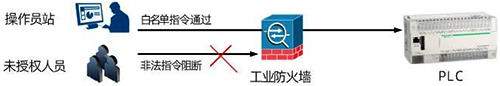 那么第2種方案,在工控設(shè)備前部署安全防護設(shè)施是目前比較可行的防護方案。通過在PLC前部署工業(yè)防火墻,來對PLC設(shè)備進行安全防護的功能,如下圖所示: