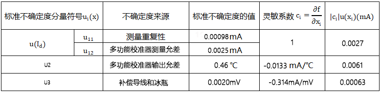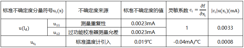 (6)由溫度變送器的輸出電流的測量重復性和多功能校準儀的測量誤差引起的不確定度分量u(Id)