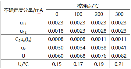 (8)對測量范圍-50~350℃的帶傳感器的溫度變送器在各校準點的測量不確定度的評定見表2。