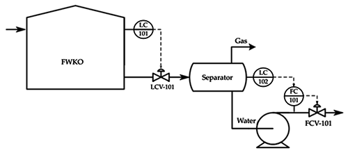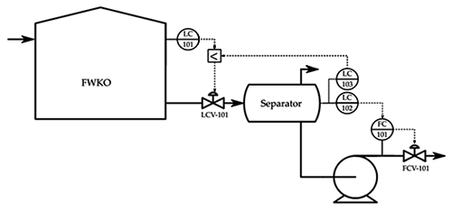 分離器液位控制由進(jìn)口流量控制閥LCV-01控制,F(xiàn)WKO罐液位由泵排出處的控制閥(LCV-02)控制。這種嵌套控制方案是一種更清晰、更可靠的設(shè)計,提供了更好的總體性能。其實(shí)還有更簡單的處理辦法,解決控制問題并不一定要重新設(shè)計控制方案。