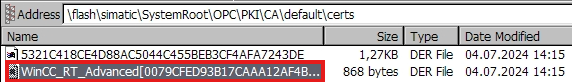 下載程序后,精智面板上會自動創建OPC UA客戶端證書文件。可以看到證書的創建時間是GMT+0 時區的2024/7/4 14:15。