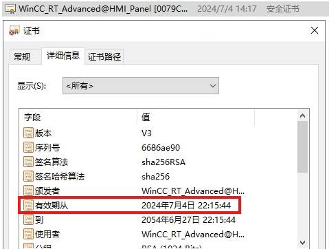 當精智面板與WinCC試圖建立通信時,OPC UA 服務器要驗證精智面板證書。查看服務器中的客戶端證書信息,結果發現證書的有效期是從GMT+8時區的2024/7/4 22:15才開始的。這個時間還沒到呢,所以不滿足證書的有效期。證書無效,OPC UA通信自然也就無法正常建立了。