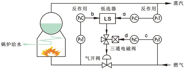 說明:圖中P1C為根據蒸汽壓力調節燃氣量的調節系統;P2C為根據燃氣鍋爐進口壓力調節燃氣量的調節系統;P3C是根據燃氣總管壓力調節燃氣量的調節系統正常工況時,蒸氣壓力P1上升,a下降,d下降,閥門關小,燃料氣流量減小,使P1下降,實現控制。