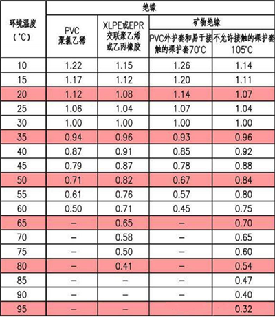 ◆環境空氣溫度不同于30℃時的校正系數(用于敷設在空氣中的電纜載流量)